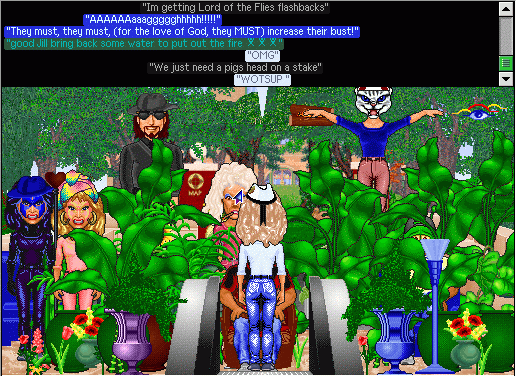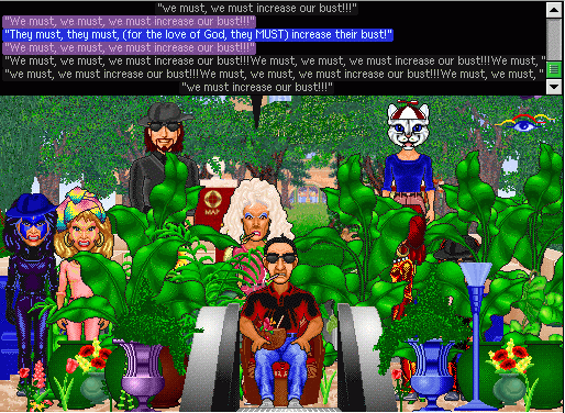 The early morning of March 6th marks a historic event in WorldsAway… The First “Bigger Bust” Protest was staged in the Club Connect Courtyard by the Train Station Entrance. Many avatars are unhappy that the bodies of the “athletic female” are SO flat-chested, so a group of them banded together to complain about this issue. The protest was organized by Jill, Raven’s Claw and Midnight Madness (PHP) with the assistance of many loyal followers such as WHAT, IsleSweety, Shadez, Re§tle§§ and others. Ziggy paid a special contribution to the cause by changing Heads on a regular basis and hiding in the foliage (can you spot him?). Moral support was provided by wsBEG.